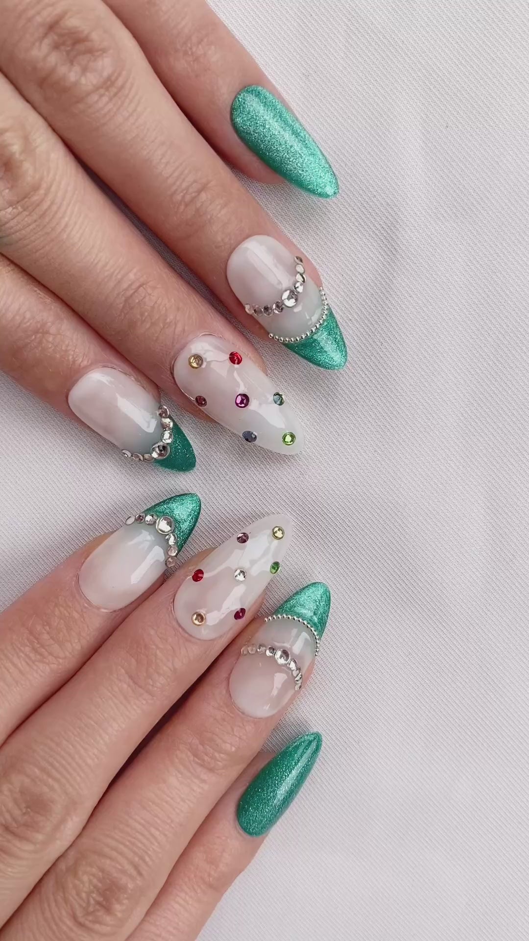 エメラルド チャーム ネイル デザインは、エレガントなグリーンのフレンチ チップとマルチカラーのラインストーンが組み合わさって、豪華で輝く効果を生み出します。このネイル アートは、ファッションと個性を求める女性に最適で、どんな場面でも指先を輝かせます。