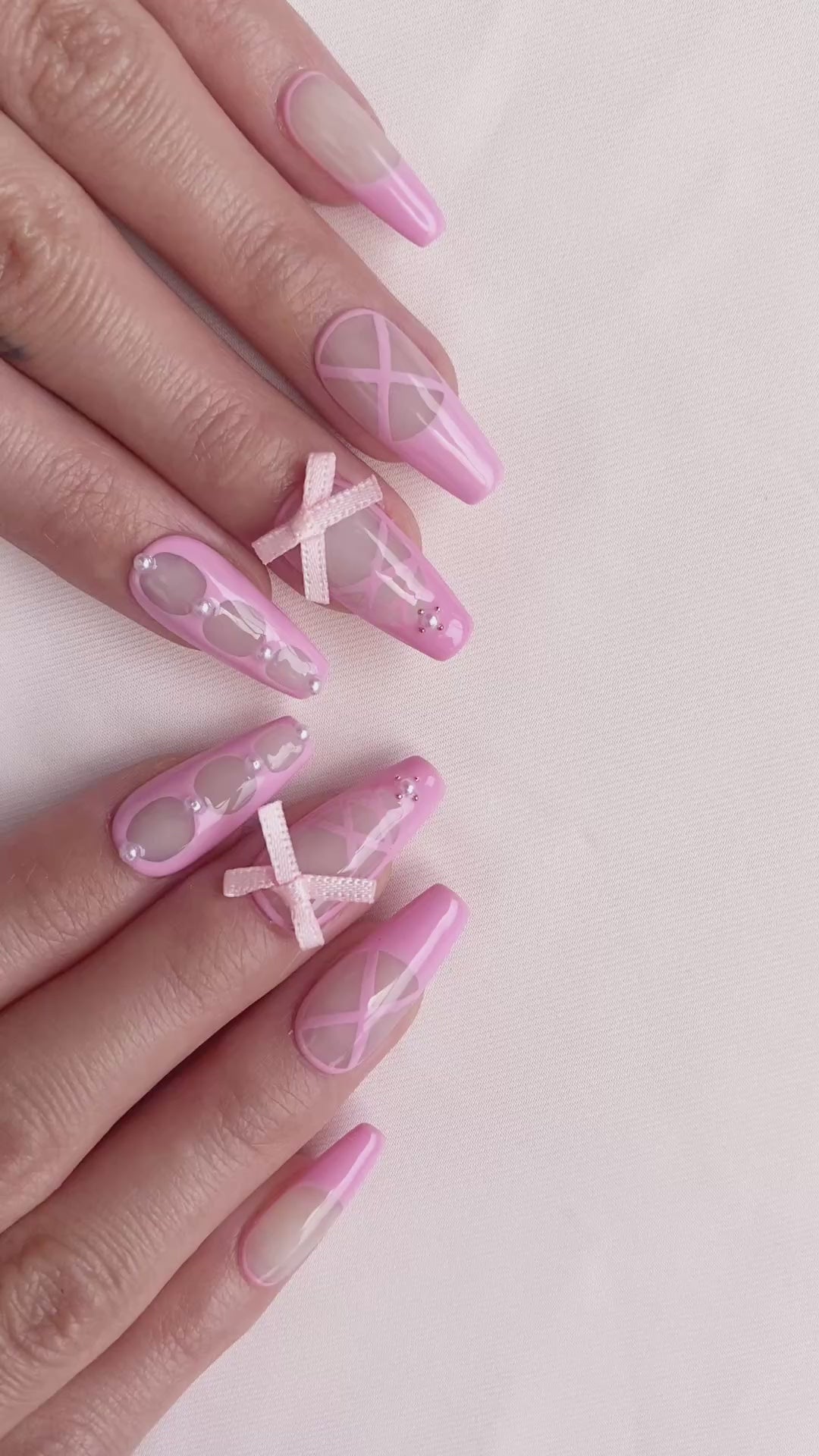 バレエ ドリーム ネイル デザインは、柔らかいピンクの色合いにリボンとパールの要素を組み合わせ、優雅さと夢のようなバレエ シューズのような雰囲気を醸し出します。このデザインは、甘くてロマンチックなスタイルが好きな人にぴったりで、普段使いにも特別な機会にも最適です。