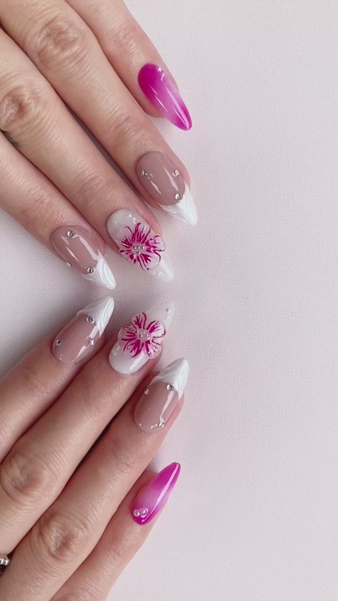 ブロッサム グレース ネイル デザインは、さわやかなピンクと純白のトーンを特徴とし、手描きの花と輝くビーズで飾られ、優雅さとロマンスを醸し出します。春のお出かけや結婚式に最適なこのネイル セットは、細部にまで魅力を添えます。