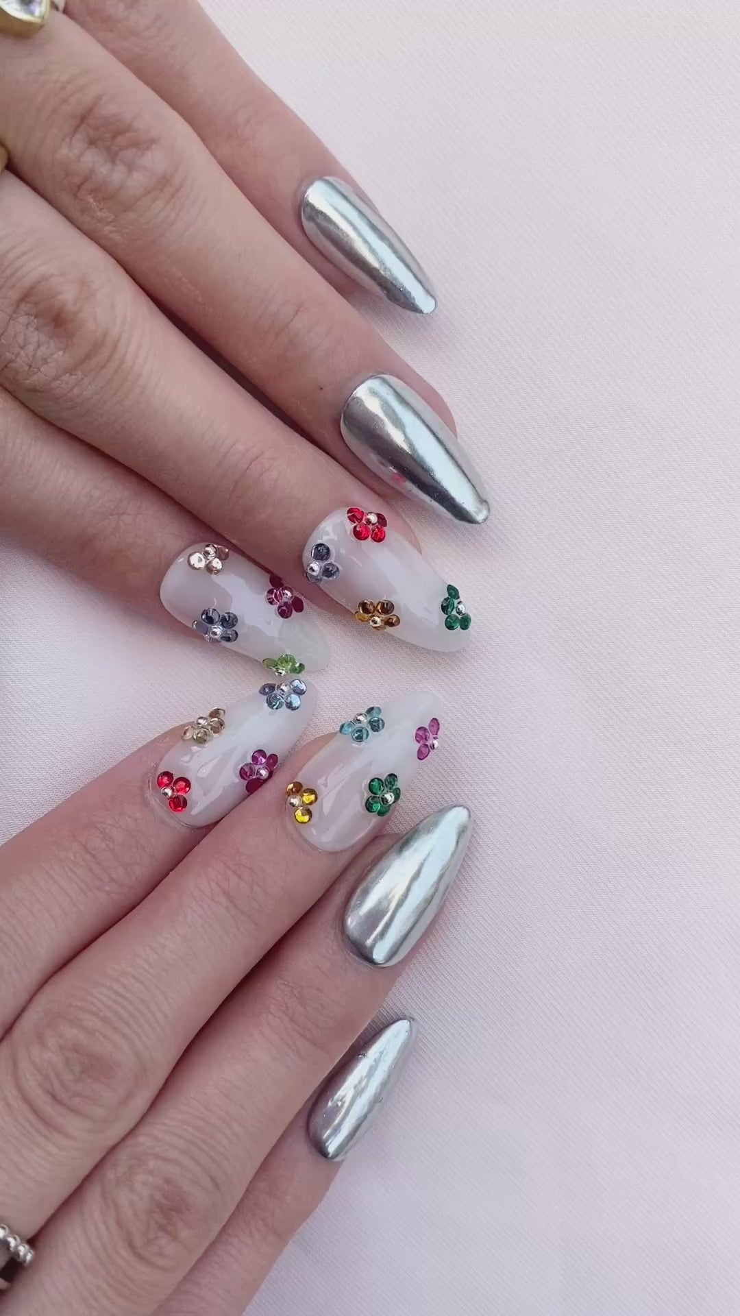 クリスタル ブルーム ネイル デザインは、まばゆいばかりのシルバー ミラー効果と鮮やかな花のラインストーンを組み合わせ、独特の高級感を演出します。パーティーでも普段使いでも、このネイル アートはどんな場面でもあなたを輝かせ、あなたのファッショナブルなテイストを際立たせます。