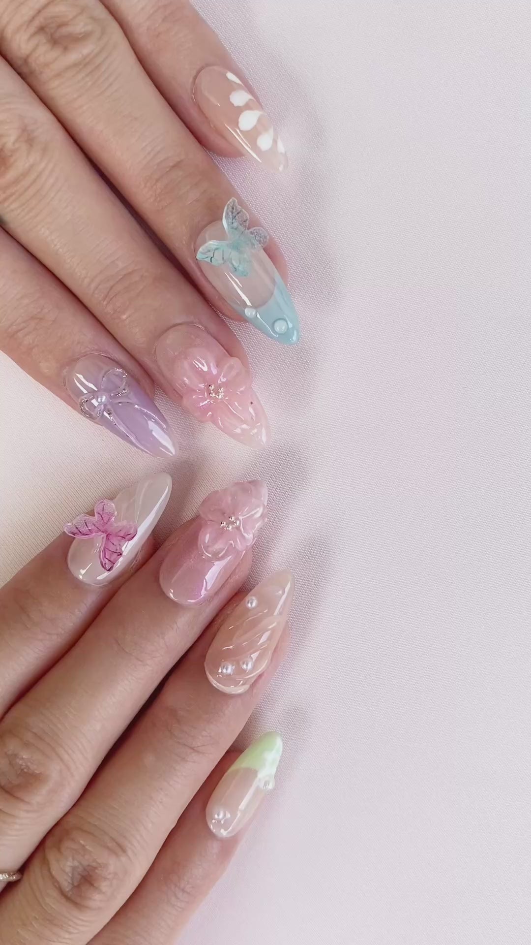 フラッタリング ブルーム ネイル デザインは、ピンク、パープル、ブルーの柔らかな色合いを組み合わせ、繊細な花と蝶のアクセントで飾られ、甘く夢のような雰囲気を醸し出します。このネイル セットは、春の活気とロマンスに満ちており、まるで指先に庭園の美しさをもたらしているかのようで、自然の魅力を醸し出すのに最適です。