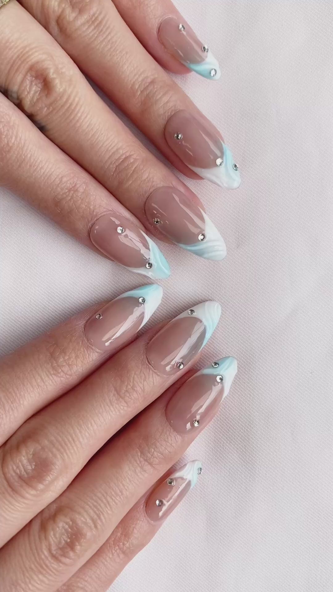 フロステッド ドリーム ネイル デザインは、柔らかいアイシー ブルーのグラデーションにヌード ベースと繊細なラインストーンを組み合わせ、夢のようなエレガントな外観を作り出します。このネイル アートは、普段使いに最適で、特別な機会に輝きとロマンスのタッチを加えます。