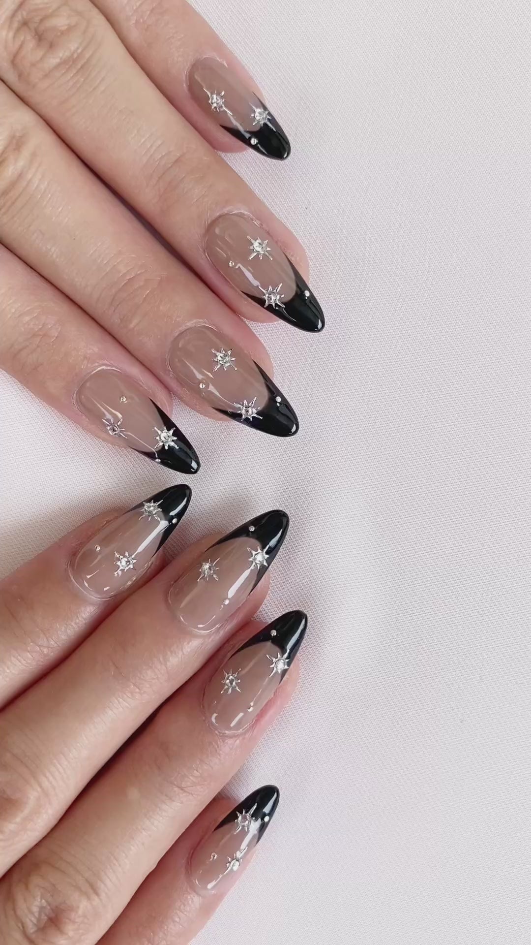 ナイト スター ネイル デザインは、黒のフレンチ チップとシルバーの星のアクセントを組み合わせ、神秘的でエレガントな雰囲気を醸し出します。秋冬のファッションにぴったりのこのネイル アートは、指先に深みのある魅力を加え、どんな場面でも目立つこと間違いなしです。