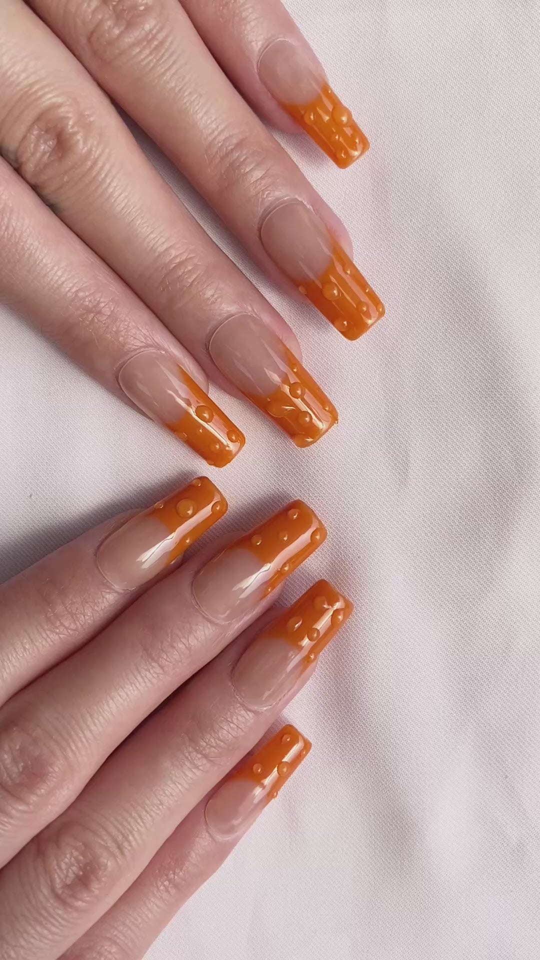 オレンジ リズム ネイル デザインは、鮮やかなオレンジのフレンチ チップと 3D ドロップレットのアクセントが特徴で、遊び心のあるモダンなスタイルを体現しています。ユニークな個性とファッション センスを表現したい女性にぴったりのこのネイル アートは、指先にエネルギーと自信をもたらします。