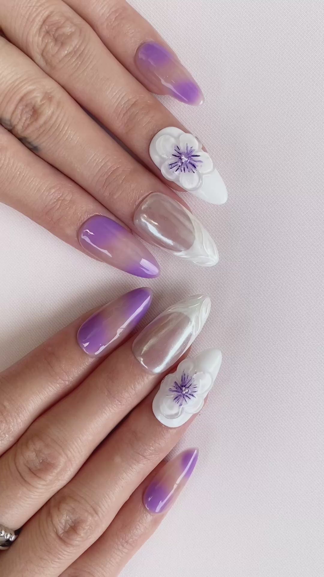 バイオレット ドリーム ネイル デザインは、エレガントな紫のグラデーションと純白の花を組み合わせ、ロマンチックで夢のような効果を生み出します。繊細な手作りの花のデザインにより、このネイル セットはあらゆる機会に最適ですが、特に春と夏の季節にあなたのユニークなファッション センスを強調するのに最適です。