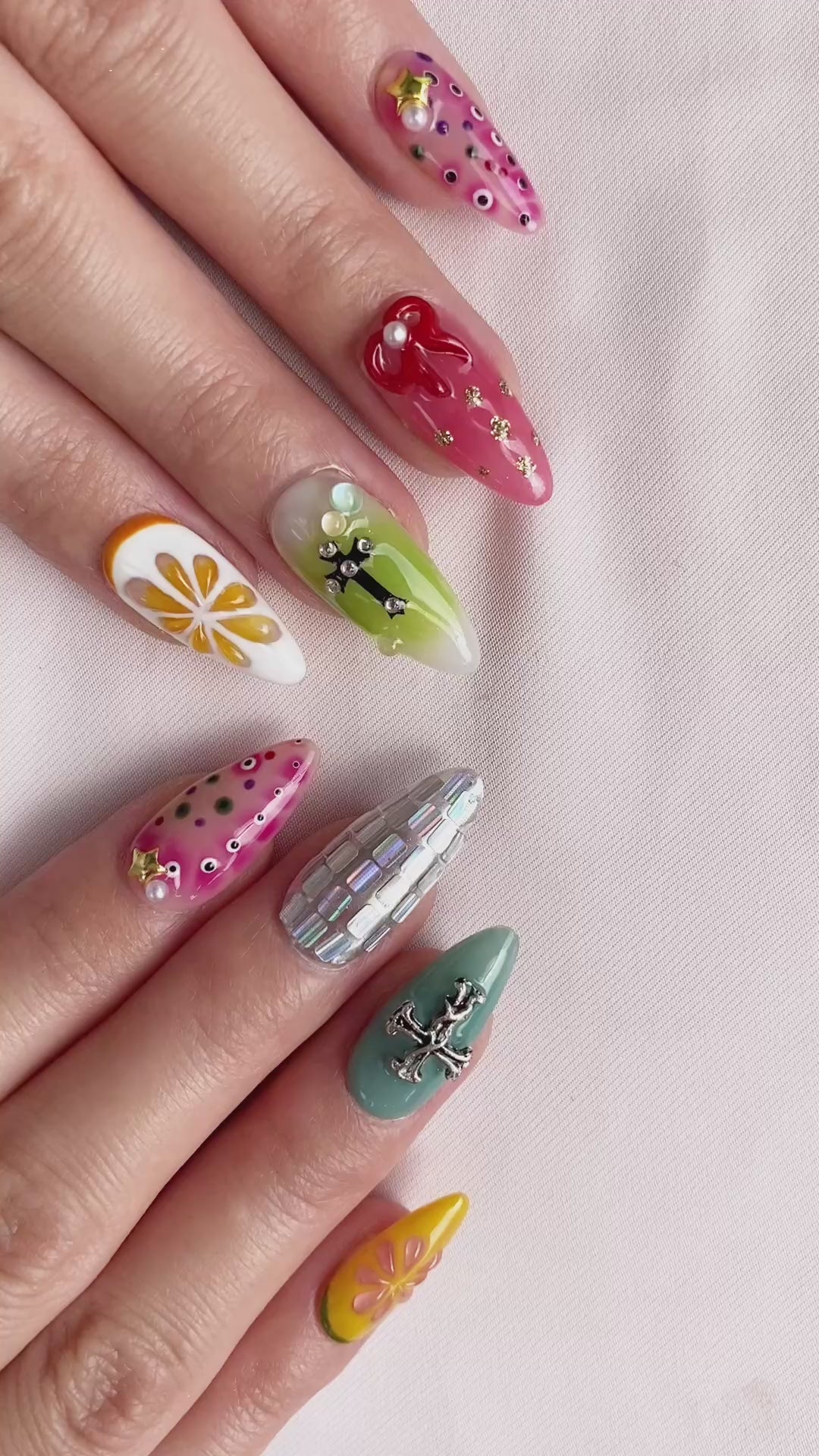 ビビッド ワンダーランド ネイル デザインは、複数の色と要素を巧みに組み合わせ、指先に視覚的なごちそうをもたらします。花柄から十字架の装飾まで、それぞれのネイルはユニークな個性と魅力に満ちており、創造性とファッションの融合を完璧に表現しています。このネイル セットは、個性とユニークなスタイルを求める人に最適です。