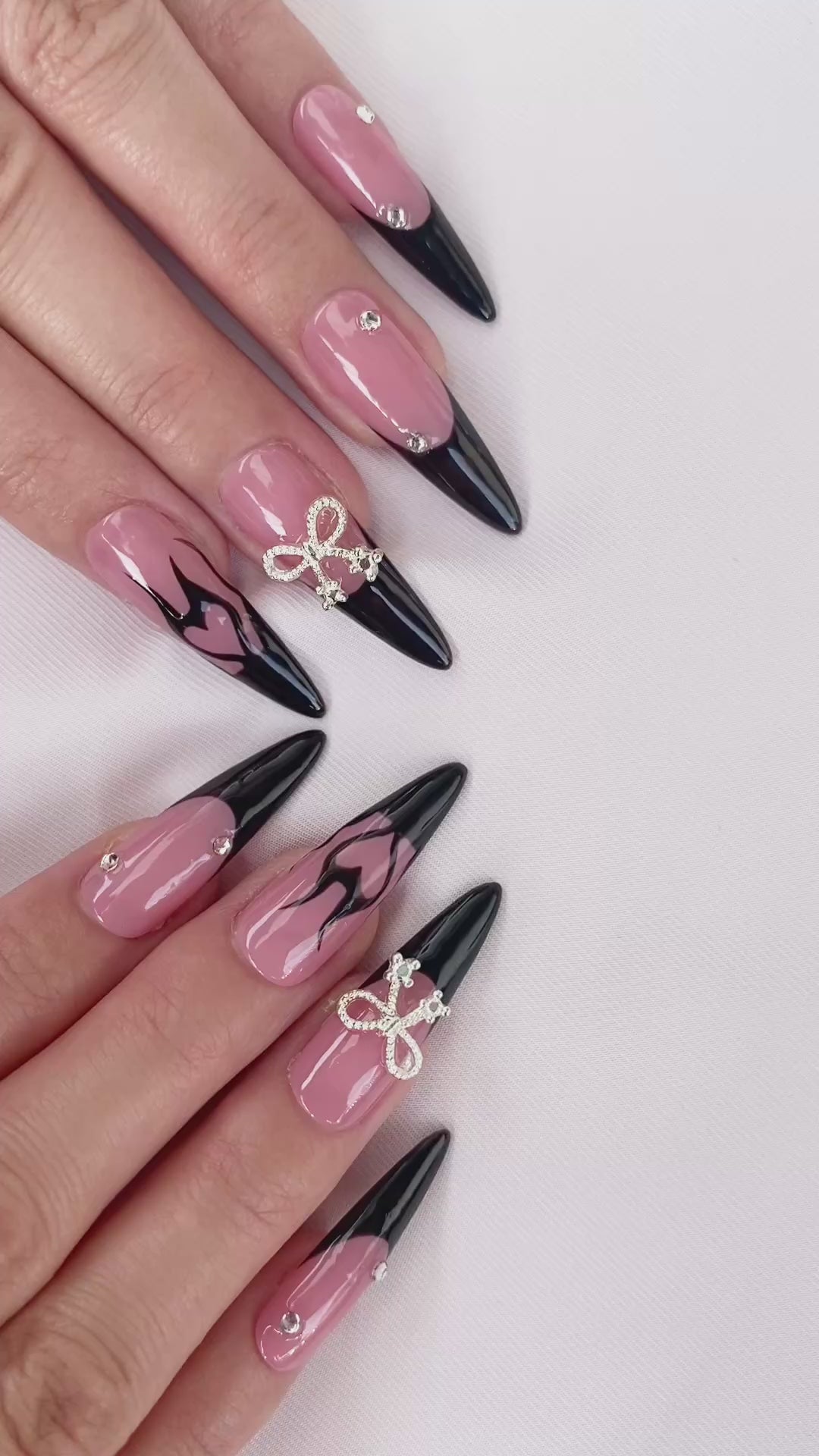 The Noir Rose nail design features deep black stiletto tips paired with soft nude pink and accented with delicate silver bow embellishments, exuding a unique blend of elegance and fashion-forward style. Perfect for those who want to showcase their distinctive personality and grace, this nail art will make you the center of attention in any setting.