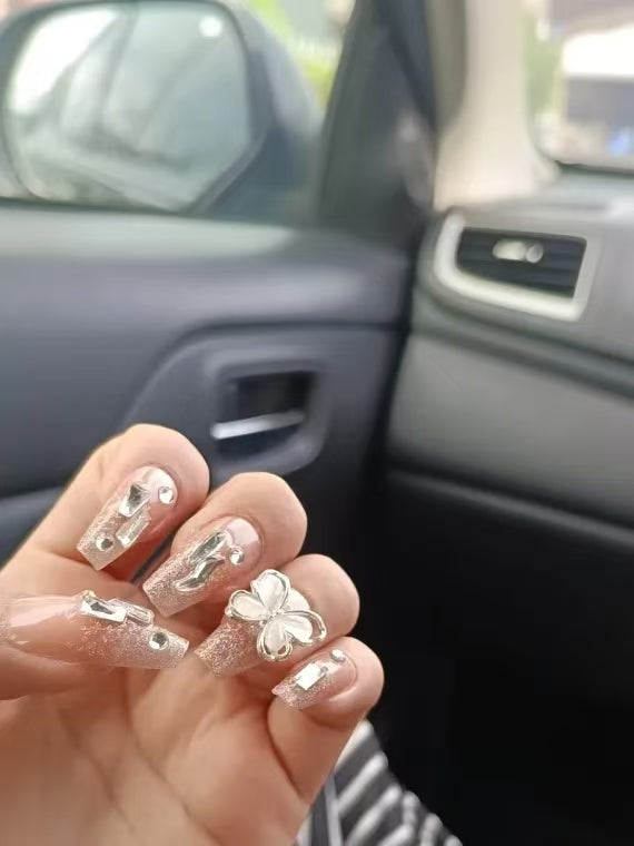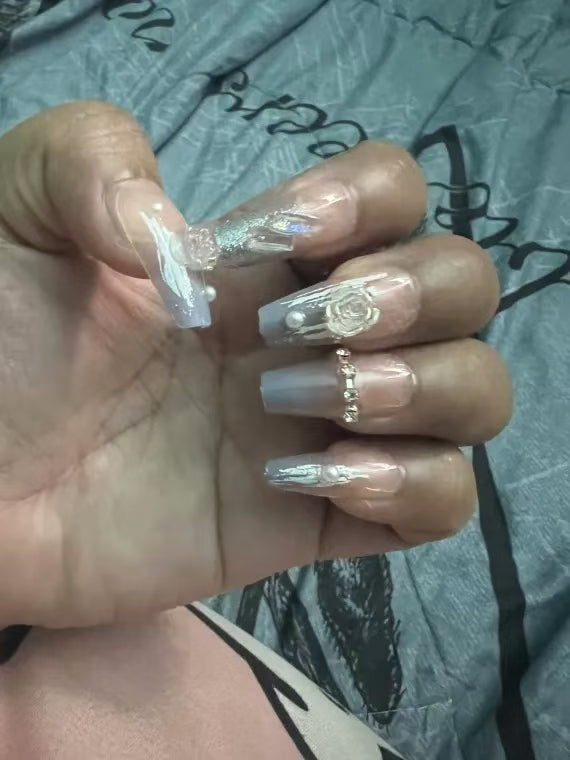 The Sky Dance nail design features a soft blue gradient as its main theme, paired with delicate embellishments to evoke the freshness and dreaminess of the sky. Perfect for everyday wear or special occasions, this nail art adds a touch of elegance and charm.